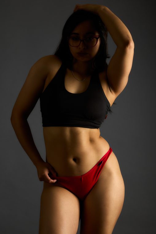 Sesión fotográfica de lencería, realizada en estudio para las redes sociales de la modelo. La sesión se realizó con fondo gris y utilizando diferentes esquemas de iluminación.